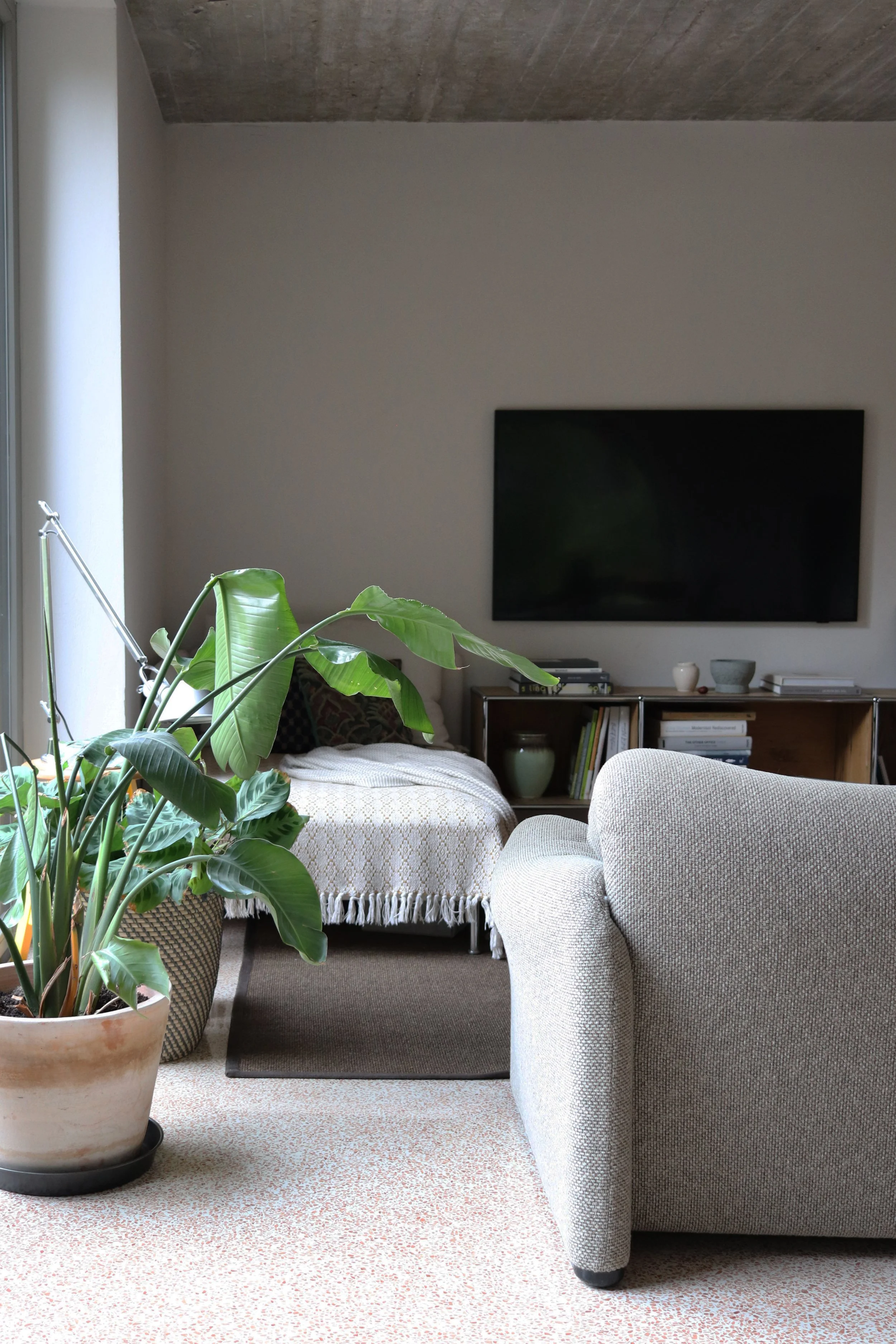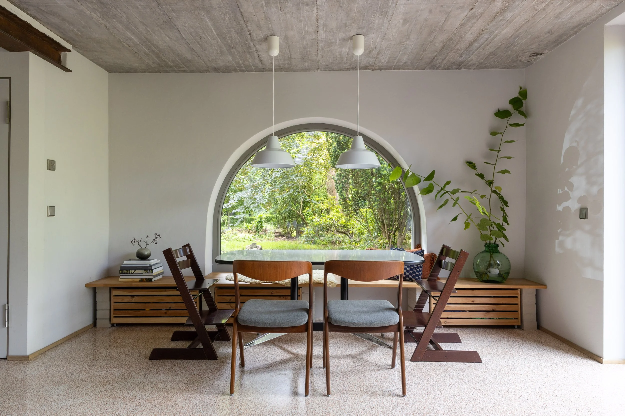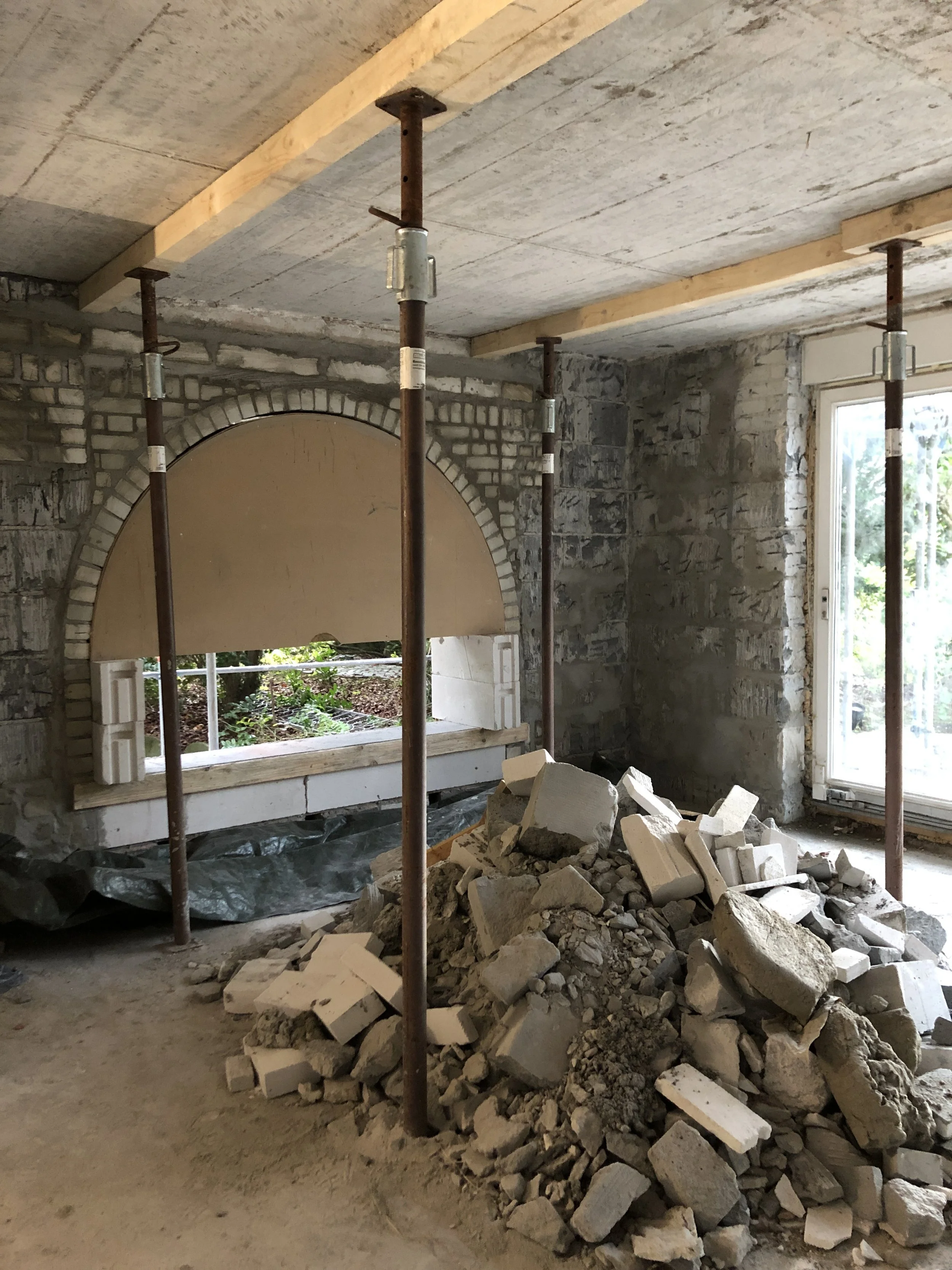 Die Sanierung begann mit der Versetzung der Eingangstür und dem Einbau eines großen Rundbogenfensters zum Garten. Das Dach wurde komplett erneuert, um den modernen Energieeffizienzstandards gerecht zu werden.