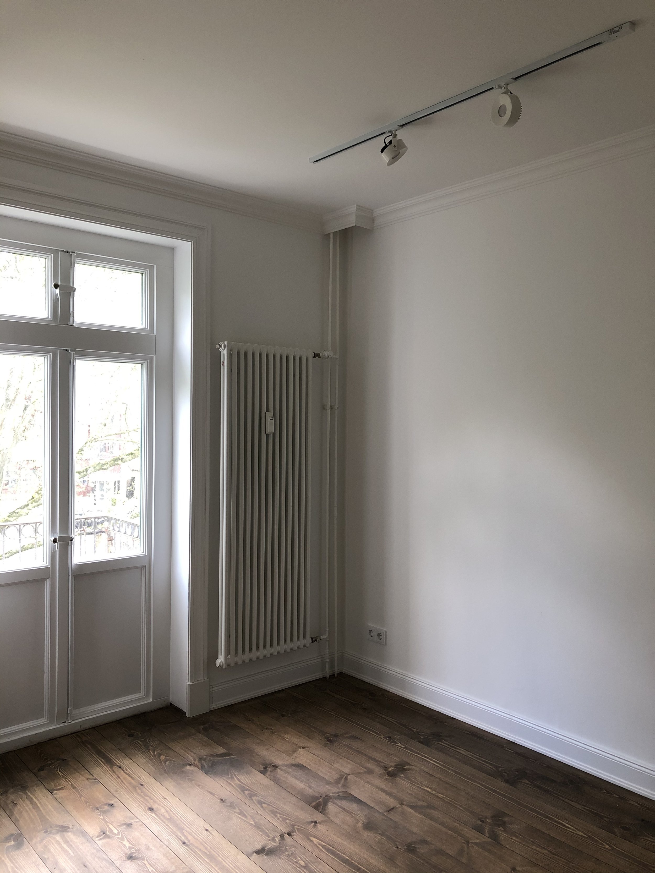 Wände wurden verschoben, Elektro- und Sanitärleitungen neu verlegt, der Stuck rekonstruiert. Die Bäder wurden komplett entkernt und neu gestaltet. Der Dielenboden – dem Holzwurm und der Zahn der Zeit zugesetzt hatten – erhielt einen neuen Schliff. Stark beschädigte Zargen und Türen wurden aufgearbeitet, Türdrücker und Metallbeschläge wurden ausgetauscht. Sämtliche Fußleisten wurden erneuert und passen jetzt ins Gesamtbild.