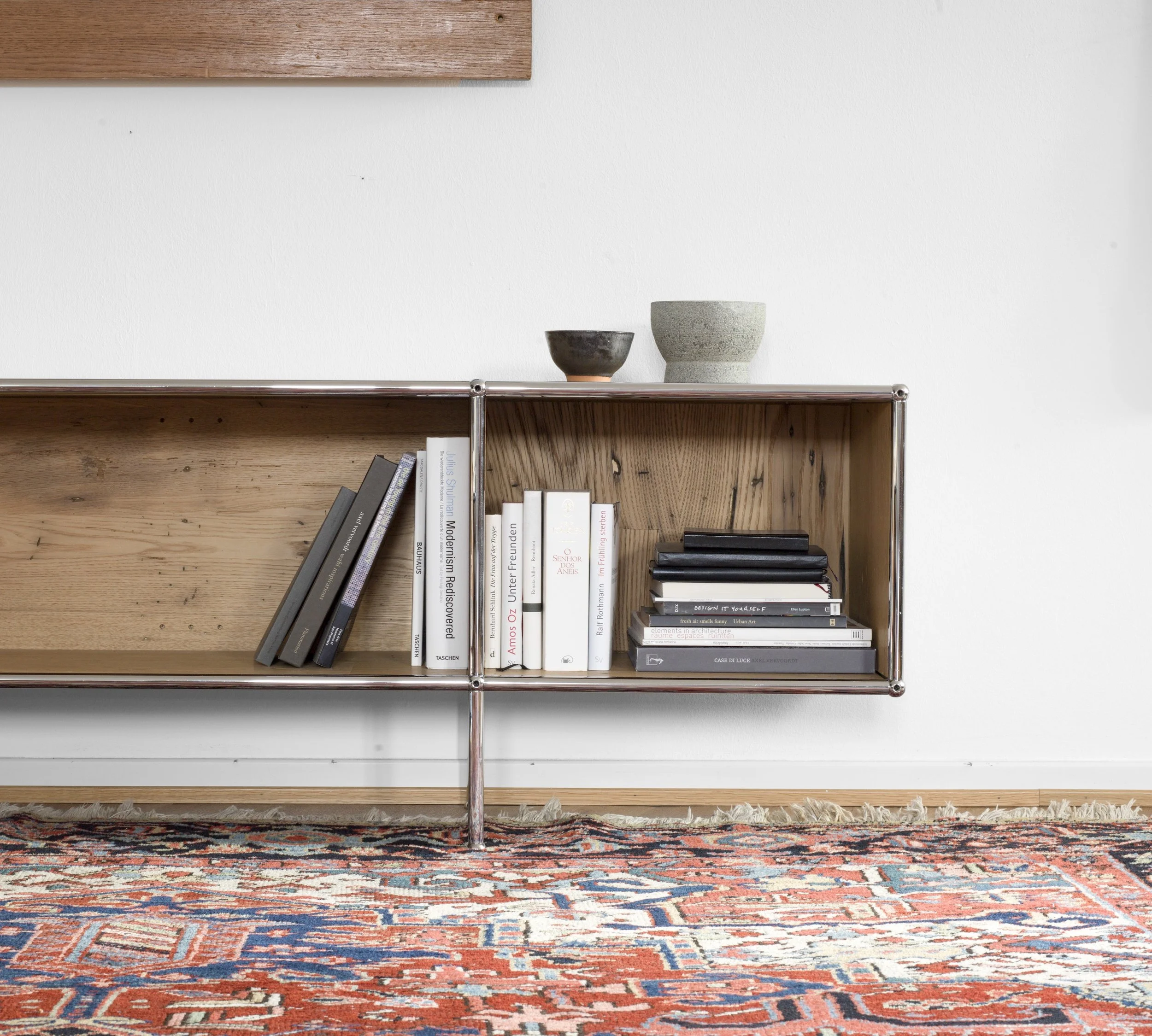 Der Raum lebt von Farbkontrasten, dem Zusammenspiel aus gelebten und neuen Oberflächen und der Möblierung aus Erbstücken und Designklassikern.